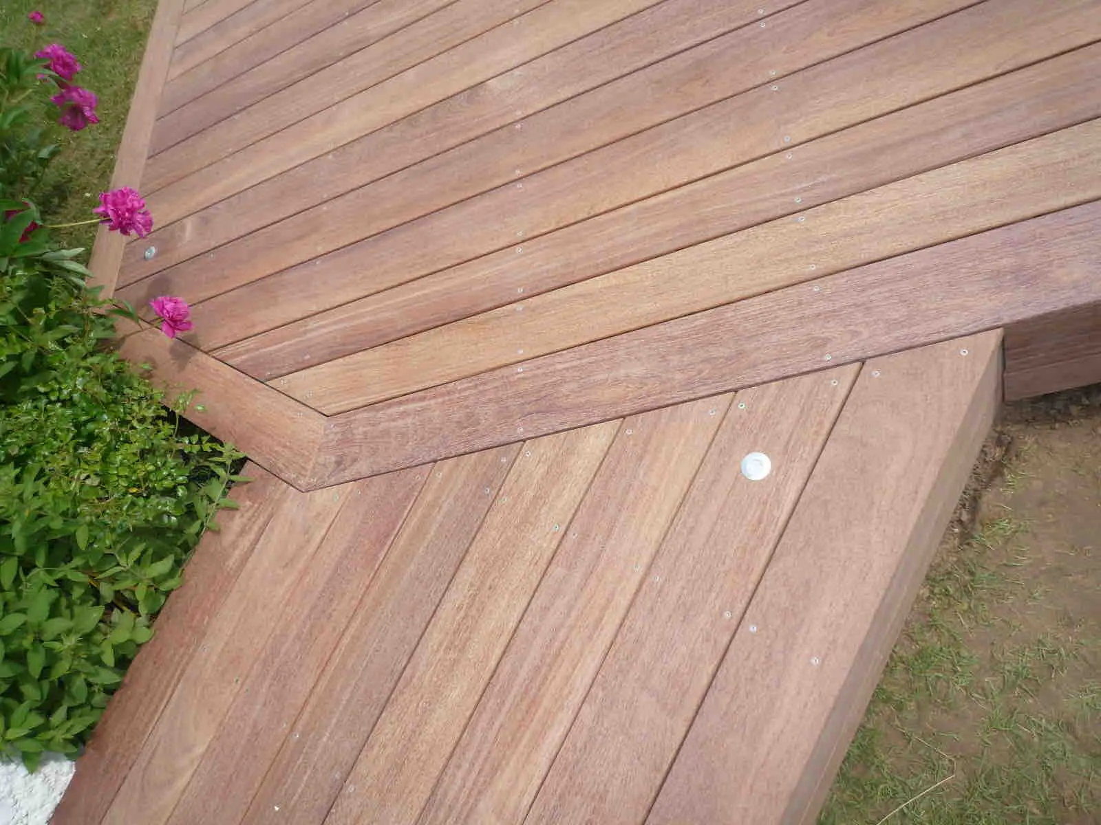 Demande particulière : Comme la place devant la baie du salon était insuffisante, nous avons créer une terrasse sur le coté avec un cheminement. Cette ilot de bois a permis aux clients d’installer une grande table et de vraiment profiter de leur jardin.